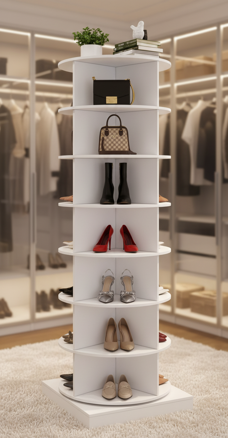 Keep your footwear organized with this modern white rotating shoe rack. Designed with 7 spacious tiers and smooth 360-degree rotation, it maximizes storage while saving floor space perfect for any home.
